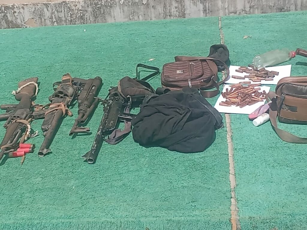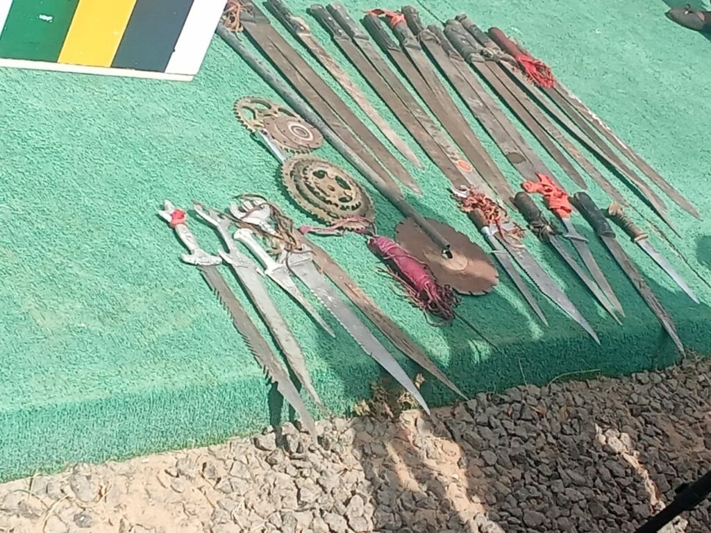 SP Habib revealed that exhibits recovered during the operation include: three (3) fabricated revolver gun rifle; one (1) fabricated SMG gun rifle; three (3) live cartridges; one (1) empty cartridge; one (1) chain and padlock; two (2) keypad phones; a blindfolded scrap, and cutlasses.