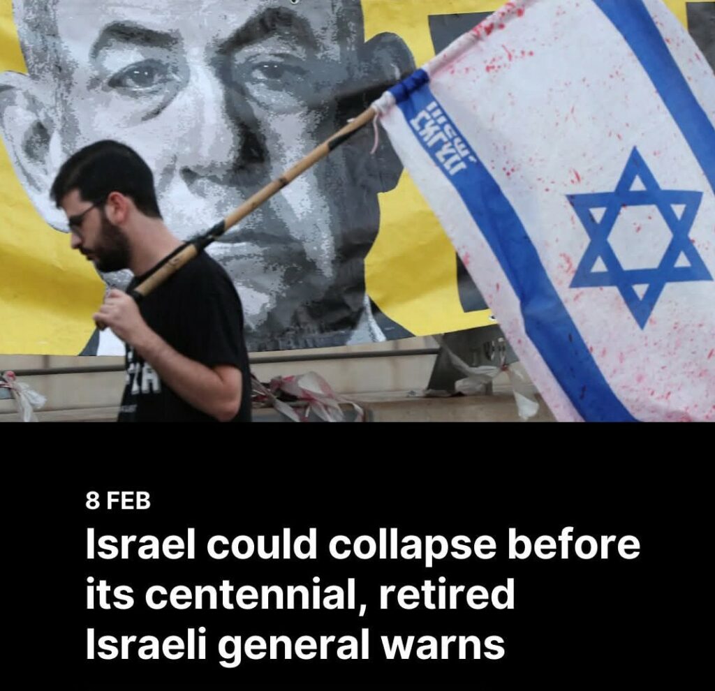 Retired Israeli Maj Gen Itzhak Brik warned Sunday that Israel could collapse before reaching the 100th anniversary of its founding in 2048, citing deep “internal divisions” and growing “international alienation,” Anadolu reports.